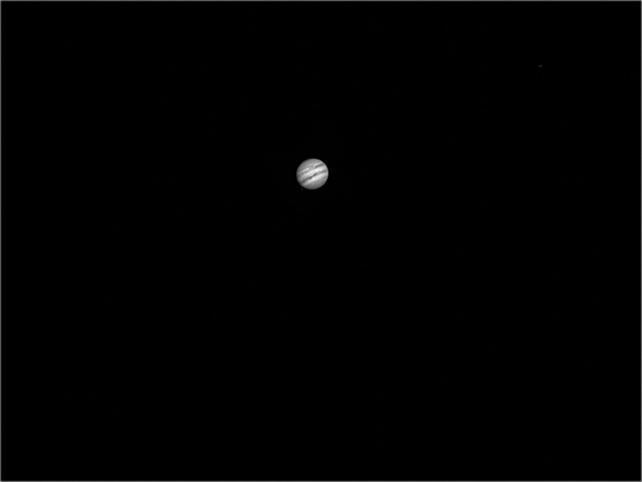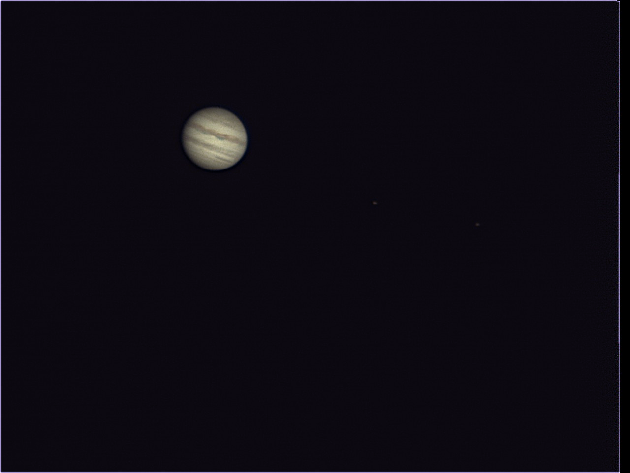 Opname van jupiter op 18 januari 2024 met dezelfde telescoop en 2x barlowlens. Opnieuw is duidelijk de rode vlek te zien. Verder zijn de manen Io en Europa te zien. |